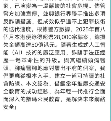 近年騙案手法層出不窮,從電話短訊到「生成式AI」合成聲音、影像,犯罪技術的演進速度,已遠超一般市民的防範能力。
